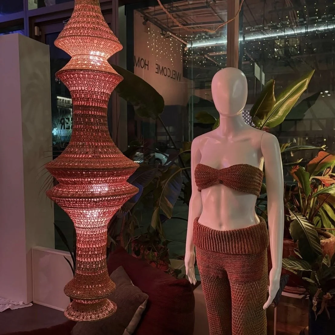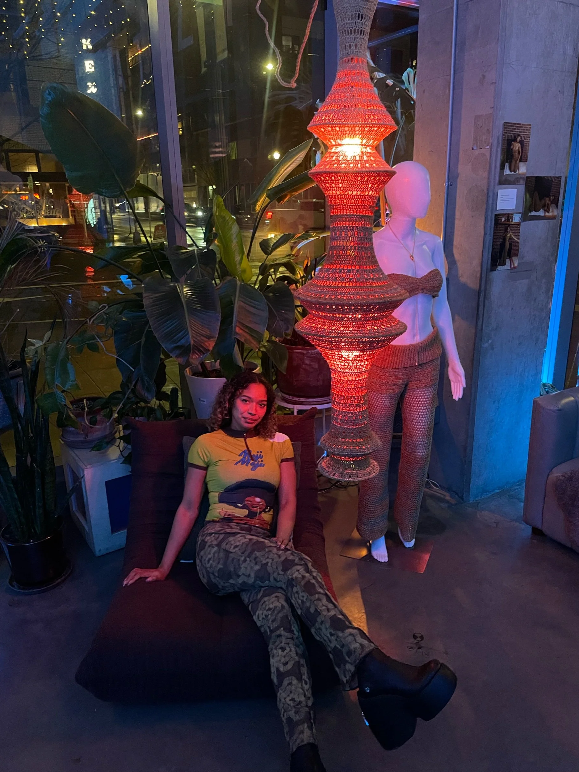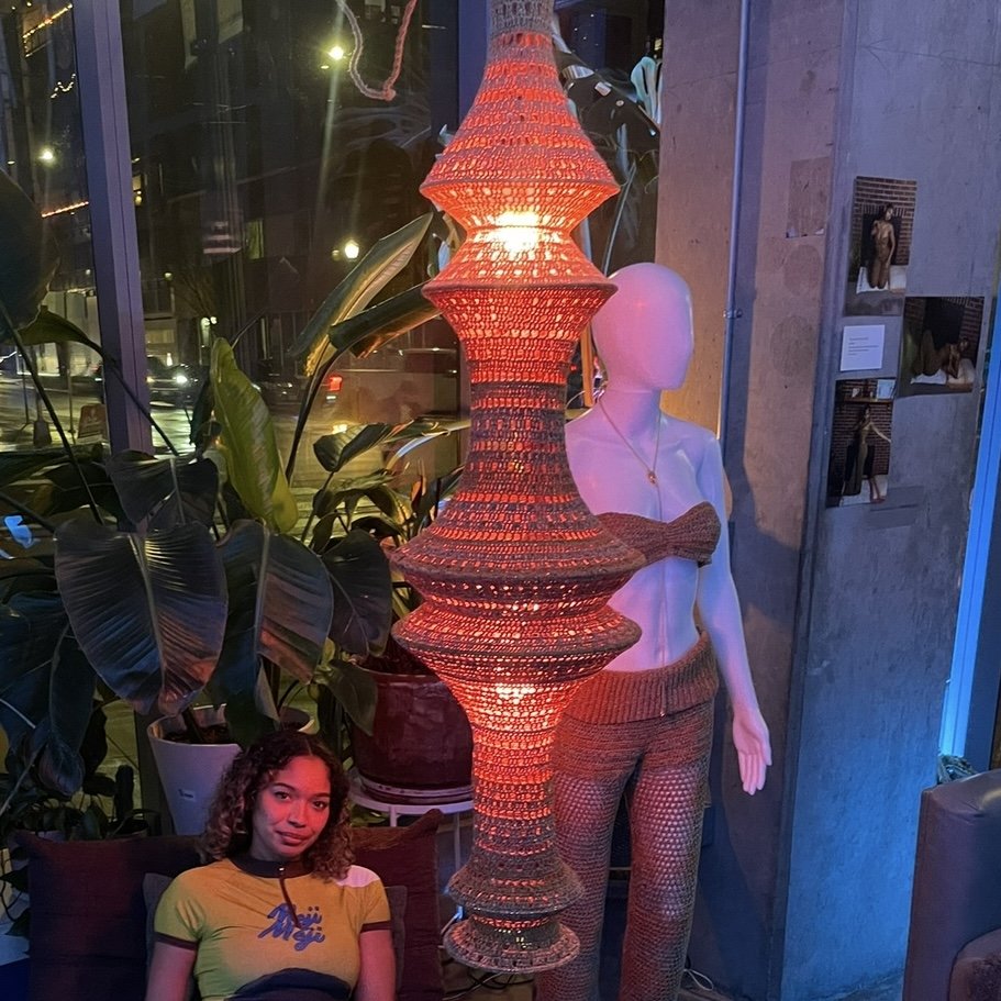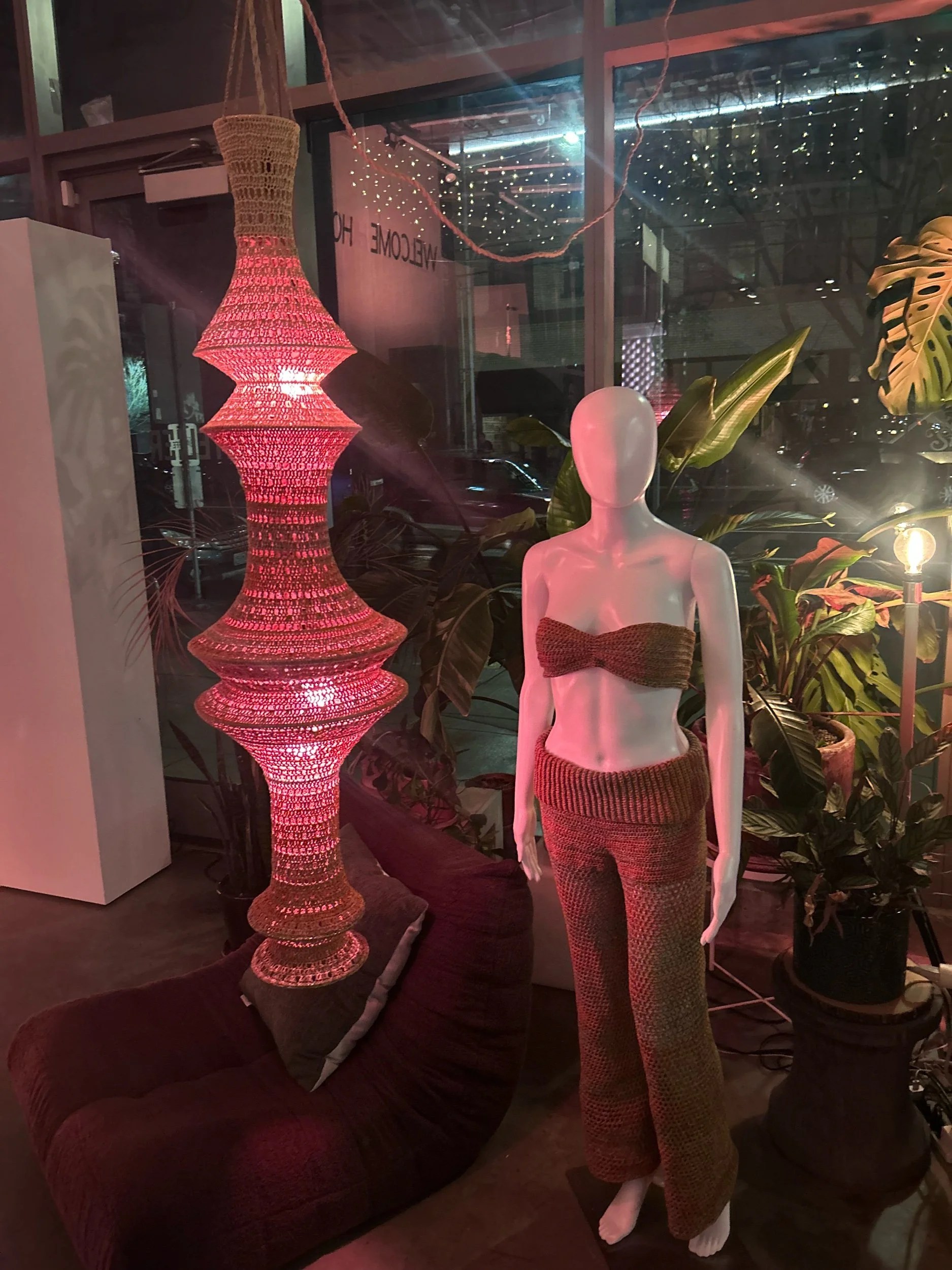 Yarn: 100% Japanese Cotton in tan & Deadstock 88% Cotton, 12% Polyamide in a burnt stone color consisting of gold, orange, blue & brown